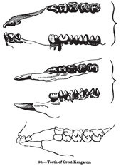 The skull has peculiarities in comparison to placental mammals. In general, the skull is relatively small and tight. Holes (foramen lacrimale) are located in the front of the orbit. The cheekbone is enlarged and extends further to the rear. The angular extension (processus angularis) of the lower jaw is bent toward the center. Another feature is the hard palate which, in contrast to the placental mammals' foramina, always have more openings. The teeth differ from that of placental mammals, so that all taxa except wombats have a different number of incisors in the upper and lower jaws. The early marsupials had a dental formula from 5.1.3.44.1.3.4, that is, per pine half; they have five maxilla or four mandibular incisors, one canine, three premolars and four molars, for a total of 50 teeth. Some taxa, such as the opossum, have the original number of teeth. In other groups the number of teeth is reduced. The dental formula for Macropodidae (kangaroos and wallabies etc.) is 3/1 – (0 or 1)/0 – 2/2 – 4/4. Marsupials in many cases have 40 to 50 teeth, significantly more than placental mammals. The upper jaw has a high number of incisors, up to ten, and they have more molars than premolars. The second set of teeth grows in only at the 3rd premolar: all remaining teeth are already created as permanent teeth.