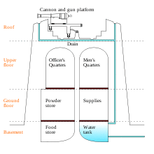 The interior of a classic British Martello tower consisted of two storeys (sometimes with an additional basement). The ground floor served as the magazine and storerooms, where ammunition, water, stores and provisions were kept. The garrison of 24 men and one officer lived in a casemate on the first floor, which was divided into several rooms and had fireplaces built into the walls for cooking and heating.[6] The officer and men lived in separate rooms of almost equal size. A well or cistern within the fort supplied the garrison with water. An internal drainage system linked to the roof enabled rainwater to refill the cistern.[6]