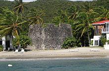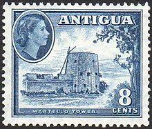 The British originally constructed River Fort Martello Tower in the early 19th century, on the site of a previous fort (presumed to have been built by the Spanish) to guard nearby River Landing, which was Barbuda's original quay. Confusion with the previous fort presumably explains the claims made in Barbudan tourism publications that this was the World's first, and is its oldest, Martello tower, built in 1745.[28] The tower is located on the south coast of the island, a mile or so from River Landing and some seven miles south of the island's main village of Codrington. The tower is 56 feet high, has a raised gun platform and extremely thick walls, but is missing the floors. It the first such tower constructed in the Caribbean, was built in 1745 by Sir William Codrington, and was designed by Commodore Charles Knowles RN, later Admiral Sir Charles Knowles Bt, who was then commanding the Leeward Islands station.[29]