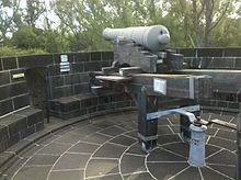 The British built five Martello Towers between 1832 and 1835 at Grand River North West (2), Black River (2), and Port Louis (1), of which three survive. One tower, named Cunningham Tower after Lieutenant-Colonel Cunningham, the commanding Royal Engineer, was constructed as part of Fort George at the northern side of the entrance to Port Louis harbour. Two towers were built at Grand River North West; on the south-west side of the river bay the tower was built at Pointe aux Sables whilst Fort Victoria was built covering the north-eastern flank. The remaining two were built to support existing batteries, which were also improved, at the mouth of the Black River; one to the north at La Preneuse and the other south of Grande-Rivière-Noire at Batterie de l'Harmonie. Cunningham Tower disappeared after 1914.[44] The Tower at Fort Victoria was last mentioned in 1880. In 1865, the Mauritius Almanac and Civil Service Register listed "Two Artillery Men, at 1s each per diem", for the towers at Fort George and Grand River.[45] The Friends of the Environment have restored one Martello tower near the La Preneuse public beach, in the Rive Noire/Black River district. The Friends operate it as a museum for visitors. The original entrance to the tower is raised above ground but a new entrance has been constructed at ground level. The other tower in Rive Noire/Black River district [L’Harmonie] still exists but has remained neglected for many years. The other existing tower is at Pointe aux Sables, Grand River North West.