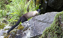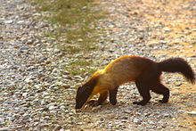 The yellow-throated marten is a diurnal hunter, which usually hunts in pairs, but may also hunt in packs of three or more. It preys on rats, mice, hares, snakes, lizards, eggs and ground nesting birds such as pheasants and francolins. It is reported to kill cats and poultry. It has been known to feed on human corpses, and was once thought to be able to attack an unarmed man in groups of 3 to 4.[3] The yellow-throated marten may prey on small ungulates.[4] In the Himalayas and Burma, it is reported to frequently kill muntjac fawns,[3] while in Ussuriland the base of its diet consists of musk deer, particularly in winter. The young of larger ungulate species are also taken, but within a weight range of 10 to 12 kg. In winter, the yellow-throated marten hunts musk deer by driving them onto ice. Two or three yellow-throated martens can consume a musk deer carcass in 2 to 3 days. Other ungulate species preyed upon by the yellow-throated marten include young wapiti, spotted deer, roe deer and goral.[4] Wild boar piglets are also taken on occasion.[5] It may prey on panda cubs[12] and smaller marten species, such as sables.[4] In areas where it is sympatric with tigers, the yellow-throated marten may trail them and feed on their kills.[5] Like other martens, it supplements its diet with nectar and fruit,[3] and is therefore considered to be an important seed disperser.[13] The yellow-throated marten has few predators, but occasionally may fall foul of much larger carnivores; remains of sporadic individuals have turned up in the scat or stomachs of Siberian tigers and Asian black bears.[14][15]