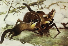 The yellow-throated marten holds extensive, but not permanent, home-ranges. It actively patrols its territory, having been known to cover over 10 to 20 km in a single day and night. It primarily hunts on the ground, but can climb trees proficiently, being capable of making jumps up to 8 to 9 meters in distance between branches. After March snowfalls, the yellow-throated marten restricts its activities up treetops.[11] Estrus occurs twice a year, from mid-February to late March and from late June to early August. During these periods, the males fight each other for access to females. Litters typically consist of two or three kits and rarely four.[5]