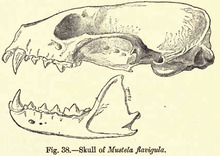 The yellow-throated marten is a large, robust, muscular and flexible animal with an elongated thorax, a small pointed head, a long neck and a very long tail which is about 2/3 as long as its body. The tail is not as bushy as that of other martens, and thus seems longer than it actually is. The limbs are relatively short and strong, with broad feet.[2] The ears are large and broad, but short with rounded tips. The soles of the feet are covered with coarse, flexible hairs, though the digital and foot pads are naked and the paws are weakly furred.[9] The skull is similar to that of the beech marten, but is much larger. The baculum is S-shaped, with four blunt processes occurring on the tip. It is larger than other Old World martens; males measure 500–719 mm (19.7–28.3 in) in body length, while females measure 500–620 mm (20–24 in). Males weigh 2.5–5.7 kg (5.5–12.6 lb), while females weigh 1.6–3.8 kg (3.5–8.4 lb).[10] The anal glands sport two unusual protuberances, which can be used to secrete a strong smelling liquid for defensive purposes.[6]