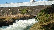 Mathur Aqueduct is a concrete structure held up by 28 huge pillars; the maximum height of the pillars reaching 115 feet (35 m). The trough structure is 7 ft in height, with a width of 7.5 ft (2.3 m). The trough is partly covered on top with concrete slabs, allowing people to walk on the bridge and also see the water going through the trough. Some of the pillars are set in rocks of the Pahrali river, though some of the pillars are set in hills on either side.