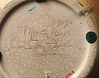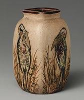 The four brothers (Wallace, Walter, Charles and Edwin) produced a distinctive type of stoneware pottery from the 1870s through to 1914, when their pottery closed,[1] with a little work being produced through to 1923, when the last brother, Robert Wallace Martin, died. Their output included both vessels and figures. They were best known for their bird sculptures and bowls, vessels decorated with sea creatures, and tiles, fashioned in a whimsical but highly skillful style.[2] The "Wally Birds" vary, and do not represent any actual species, but generally have a large and rather fierce-looking beak, massive feet and talons, and a quizzical look in their large eyes, which have a rather human shape. Their heads lift off to reveal a cavity in the body, generally intended to store pipe tobacco.
