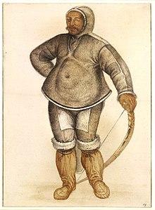 Frobisher brought with him three Inuit who had been forcibly taken from Baffin Island: a man called Calichough, a woman, Egnock, and her child, Nutioc.[72] All three died soon after their arrival in England,[73][74] Calichough dying from a wound suffered when a rib was broken unintentionally during his capture and eventually punctured his lung. The Inuit's names are reported elsewhere as Kalicho, Arnaq and Nuttaaq.[75]