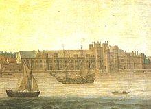 In 1576, Frobisher persuaded the Muscovy Company to license his expedition. With the help of the company's director, Michael Lok (whose well-connected father William Lok had held an exclusive mercers' license to provide Henry VIII with fine cloths),[36] Frobisher was able to raise enough capital for three barques: Gabriel and Michael of about 20–25 tons each, and an unnamed pinnace of ten tons, with a total crew of 35.[37][38] Queen Elizabeth sent word that she had "good liking of their doings", and the ships weighed anchor at Blackwall on 7 June 1576. As they headed downstream on the Thames, Elizabeth waved to the departing ships from a window of Greenwich Palace, while cannons fired salutes and a large assembly of the people cheered.[39][40]
