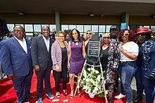 In 2006, Watts Branch Park, a park in Washington that Gaye frequented as a teenager, was renamed Marvin Gaye Park.[144] Three years later, the 5200 block of Foote Street NE in Deanwood, Washington, D.C., was renamed Marvin Gaye Way.[145] In August 2014, Gaye was inducted to the official Rhythm and Blues Music Hall of Fame in its second class.[146] In October 2015, the Songwriters Hall of Fame announced Gaye as a nominee for induction to the Hall's 2016 class after posthumous nominations were included.[147][148] Gaye was named as a posthumous inductee to that hall on March 2, 2016.[149][150] Gaye was subsequently inducted to the Songwriters Hall on June 9, 2016.[151] In July 2018, a bill by California politician Karen Bass to rename a post office in South Los Angeles after Gaye was signed into law by President Donald Trump.[152]