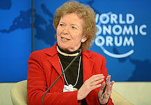 Robinson is Chairman of the Institute for Human Rights and Business[6] and served as Chancellor of the University of Dublin from 1998 until 2019. Robinson also visits other colleges and universities where she lectures on human rights. Robinson sits on the board of the Mo Ibrahim Foundation, an organisation which supports good governance and great leadership in Africa, and is a member of the Foundation's Ibrahim Prize Committee. Robinson is also a B Team Leader, alongside Richard Branson, Jochen Zeitz and a group of leaders from business and civil society as part of The B Team.[7] Robinson is an Extraordinary Professor in the Centre for Human Rights and the Centre for Sexualities, AIDS and Gender at the University of Pretoria.[8] Robinson served as Oxfam's honorary president from 2002 until she stepped down in 2012 and is honorary president of the European Inter-University Centre for Human Rights and Democratisation EIUC since 2005. She is Chair of the International Institute for Environment and Development (IIED) and is also a founding member and chair of the Council of Women World Leaders. Robinson was a member of the European members of the Trilateral Commission.