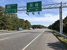 Maryland Route 10 (MD 10) is a state highway in the U.S. state of Maryland. Known as the Arundel Expressway, the highway runs 7.17 miles (11.54 km) from MD 2 in Pasadena north to Interstate 695 (I-695) near Glen Burnie. MD 10 is a four- to six-lane freeway that serves as a bypass of MD 2 through Pasadena and Glen Burnie in northeastern Anne Arundel County. The Arundel Expressway was planned as a Baltimore–Annapolis freeway to provide relief to MD 2 between the cities as early as the 1950s. However, the portion of MD 10 south of Pasadena was removed from state plans when the I-97 corridor was chosen for the intercity freeway in the 1970s. MD 10 was constructed from I-695 to MD 710 in the early 1970s and continued south to MD 648 in the late 1970s. The freeway was extended south to MD 100 and completed to MD 2 in the late 1980s and early 1990s, respectively.