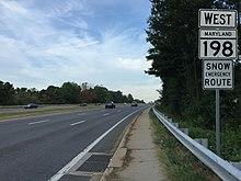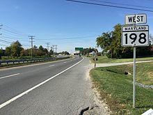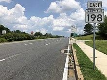 Maryland Route 198 (MD 198) is a state highway in the U.S. state of Maryland. The highway runs 14.14 miles (22.76 km) from MD 650 near Spencerville east to the entrance of Fort George G. Meade beyond its junction with MD 32. MD 198 connects Laurel in far northern Prince George's County with the northeastern Montgomery County communities of Spencerville and Burtonsville and Maryland City and Fort Meade in western Anne Arundel County. The highway is a four-to-six-lane divided highway between U.S. Route 29 (US 29) in Burtonsville and the Baltimore–Washington Parkway in Maryland City.