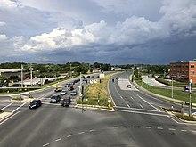 MD 198 was widened to 30 feet (9.1 m) on Montgomery Street in Laurel in 1948.[17] When the US 1 Laurel Bypass—today the northbound lanes of the U.S. Highway on Second Street—was completed, the highway was extended east one block on Montgomery Street to the new bypass in 1950 and 1951.[18] In 1963, MD 198 was removed from Montgomery Avenue and placed on its Gorman–Talbott one-way pair through Laurel in 1963. That same year, a new piece of highway was created from Van Dusen Road to Ninth Street to connect the one-way pair with Sandy Spring Road.[19][20] That same year, MD 198 was extended over the course of MD 602 to Fort Meade.[19] The first portion of MD 198 to become a divided highway was along a new alignment from Sweitzer Lane to Van Dusen Road. This highway was built concurrent with I-95 and the I-95–MD 198 interchange in 1970 and 1971.[21][22]