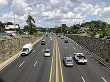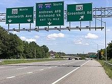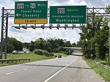 Work on the Kenilworth or Tuxedo Interchange between MD 201, the Baltimore–Washington Parkway, and the Annapolis–Washington Expressway (US 50) began in 1954.[14] The first highway through the interchange, the parkway and its continuation into Washington along New York Avenue, was completed in 1955.[19] The new alignment of MD 201 from MD 459 to the District of Columbia was completed in 1957 and opened concurrently with the adjacent portion of expanded Kenilworth Avenue in the city. The portion of John Hanson Highway from New York Avenue to the interchange opened that same year.[20] The final movements in the interchange, from MD 201 to eastbound US 50 and from westbound US 50 to MD 201, opened concurrent with the portion of John Hanson Highway from the Kenilworth Interchange to MD 704 in Lanham in 1962.[21]