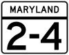 | 24.52 | 39.46 | Directional crossover intersection with MD 264; right-in/right-out intersection between northbound MD 2-4 and MD 765; northern terminus of MD 264; northern terminus of MD 765 | |||