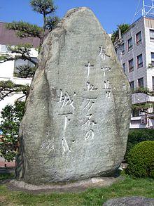 Suffering from the early symptoms of TB, Shiki sought work as a war correspondent in the First Sino-Japanese War[32] and, while eventually obtaining his goal, he arrived in China after the April 17, 1895 signing of the Treaty of Shimonoseki.[33] Instead of reporting on the war, he spent an unpleasant time harassed by Japanese soldiers[34] in Dalian, Luangtao, and the Lüshunkou District, meeting on May 10, 1895[35] the famous novelist Mori Ōgai, who was at the time an army doctor.[33]