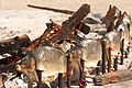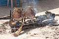 The fish is then either impaled on two sharp iron spikes, or placed in a big iron, clamshell grill with a handle and a locking snare, designed specifically for this dish.[6]