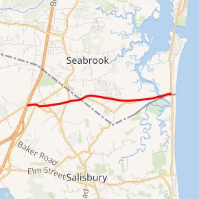 The western terminus of Route 286 is Interstate 95 in Salisbury, Massachusetts, where it is accessed via exit 60 on I-95. Traffic coming from I-95 uses Toll Road, while traffic going to I-95 uses Main Street. The divergence resolves at Pike Street, where Route 286 proceeds eastward, crossing U.S. Route 1 where it becomes Collins Street. After crossing into Seabrook, New Hampshire, Collins Street and Route 286 diverge at an intersection with South Main Street. Route 286 then continues to its eastern terminus with New Hampshire Route 1A (Ocean Boulevard), which runs north–south along the Atlantic shore, approximately 160 feet (49 m) north of the Massachusetts/New Hampshire state line.