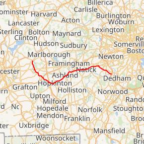 | Dedham | 29.53 | 47.52 | West Street - Dedham Square | Eastern terminus; exit 32 (old exit 17) on I-95 | |