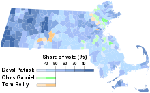 On September 19, Patrick won the Democratic primary with 50% of the vote, ahead of Gabrieli (27%) and Reilly (23%).[11]