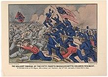 The 54th, because it was the first such regiment, attracted tremendous publicity during its formation.[20] To ensure the success of the experiment, Andrew solicited donations and political support from many of Boston's elite families. He gained the endorsement of Boston's elite by offering the regiment's command to Robert Gould Shaw, son of prominent Bostonians. The 54th Massachusetts won fame in their assault on Battery Wagner on Morris Island in Charleston Harbor, during which Col. Shaw was killed.[20] The story of the 54th Massachusetts was the basis for the 1989 film Glory.
