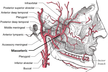 Plan of branches of internal maxillary artery. (Masseteric visible at bottom center.) | |