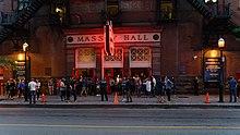 10 years after the completion of construction, a pair of fire escape staircases were installed along the front face of the building.[3] They were installed to deal with fire concerns of the building.[3] These fire escapes are considered an iconic part of Massey Hall's exterior. At some point in its renovation history, three of the windows at the front of the venue were converted into doors, The doors at the front of the venue were painted red (from their earlier brown-gold colour), a large neon sign was hung above the main entrance, and notice boards listing upcoming acts were revamped on either side of those doors.