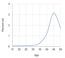The risk of the mother dying before the child becomes an adult increases by more advanced maternal age, such as can be demonstrated by the following data from France in 2007:[16]