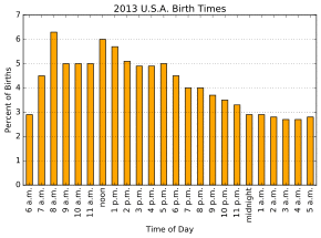 Folklore has long held that most babies are born in the late night or very early morning and recent (2018) research has found this to be correct in the US, but only for babies born at home or on Saturday or Sunday. All other births are most likely to occur between 8 a.m. and noon, a reflection of the fact that planned C-sections are generally scheduled for 8 a.m. Likewise, births from induced deliveries rose during the morning hours and peaked at 3 p.m. The most likely day of the week for a baby's birthday in the US is Monday, followed by Tuesday, likely related to scheduled deliveries as well.[42][43]