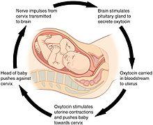 During the later stages of gestation there is an increase in abundance of oxytocin, a hormone that is known to evoke feelings of contentment, reductions in anxiety, and feelings of calmness and security around the mate.[29] Oxytocin is further released during labour when the fetus stimulates the cervix and vagina, and it is believed that it plays a major role in the bonding of a mother to her infant and in the establishment of maternal behaviour. The act of nursing a child also causes a release of oxytocin.[30]