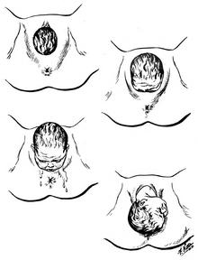 Station refers to the relationship of the fetal presenting part to the level of the ischial spines. When the presenting part is at the ischial spines the station is 0 (synonymous with engagement). If the presenting fetal part is above the spines, the distance is measured and described as minus stations, which range from −1 to −4 cm. If the presenting part is below the ischial spines, the distance is stated as plus stations ( +1 to +4 cm). At +3 and +4 the presenting part is at the perineum and can be seen.[33]