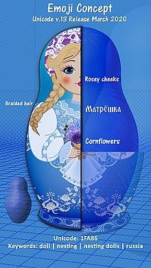 In 2020, the Unicode Consortium approved the matryoshka doll as one of the new emoji characters in release v.13.[21] The matryoshka or nesting doll emoji was presented to the consortium by Jef Gray,[22] as a non-religious, apolitical symbol of East European culture.[23]