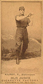 Kilroy starred as an MLB rookie during the 1886 season for the last-place Baltimore Orioles. He started 68 games, completing 66 of them while throwing 583 innings.[3] Although he had a disappointing record of 29 wins and 34 losses, he set a mark that was unequalled in major league pitching. Kilroy struck out 513 batters that season, the most ever in a single season and far ahead of second-place Charles "Old Hoss" Radbourn's total of 441 in 1884.[4] During this period there were many differences in game play from the modern rules, such as a base on balls being awarded after six balls rather than the modern four, and the pitcher being located 50 feet from home plate rather than the modern 60 feet 6 inches; it was also the last season in which batters could request either a high pitch or a low pitch. Because of these numerous subsequent rule changes, pitching records from that era are not officially compared to those of the modern era, which is variously regarded as beginning in 1893 (when the modern pitching distance was established) or 1901.