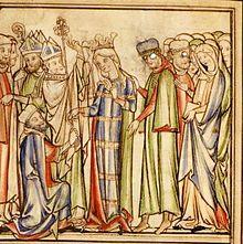 In spite of his surname and knowledge of the French language, Paris was of English birth, and is believed by some chroniclers to be of the Paris family of Hildersham, Cambridgeshire.[4] He may have studied at Paris in his youth after early education at St Albans School. The first we know of Matthew Paris (from his own writings) is that he was admitted as a monk to St Albans in 1217. It is on the assumption that he was in his teens on admission that his birth date is estimated; some scholars suspect he may have been ten years or more older; many monks only entered monastic life after pursuing a career in the world outside. He was clearly at ease with the nobility and even royalty, which may indicate that he came from a family of some status, although it also seems an indication of his personality. His life was mainly spent in this religious house. In 1248, Paris was sent to Norway as the bearer of a message from Louis IX to Haakon IV; he made himself so agreeable to the Norwegian sovereign that he was invited to superintend the reformation of the Benedictine Nidarholm Abbey outside Trondheim.