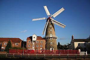 The tower mill was erected on Willoughby Road on the east side of John Rennie's Maud Foster Drain[2] for Thomas and Isaac Reckitt by the Hull millwrights Norman and Smithson in 1819. Corn for the mill was brought in by barge along the drain. The original drawings and accounts survive, telling us that it cost £1826-10s-6d. The Reckitt brothers were millers, corn factors and bakers until poor harvests in the years up to 1833 led to the mill being sold. Isaac Reckitt moved to Nottingham and then to Hull where he set up Reckitt & Sons.[3]