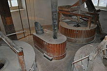Three pairs of grinding stones, two grey and one French, survive on the fourth floor with vats, spouts etc. all intact. The great spur wheel is made of iron, as is the upright shaft. The stone nuts have wooden cogs, as usual. The spout floor gives access to the reefing stage and contains a fine governor which controls all three pairs of stones. The bridge trees are made of iron and are Y-shaped with integral bridging boxes.