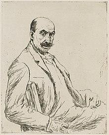 He used his own inherited wealth to assemble an impressive collection of French Impressionist works. He later chose scenes of the bourgeoisie, as well as aspects of his garden near Lake Wannsee, as motifs for his paintings. In Berlin, he became a famous painter of portraits; his work is especially close in spirit to Édouard Manet. In his work he steered away from religious subject matter, with one cautionary exception being an early painting, The 12-Year-Old Jesus in the Temple With the Scholars (1879). His painting of a Semitic-looking boy Jesus conferring with Jewish scholars sparked debate.[2] At the International Art Show in Munich it stirred up a storm for its supposed blasphemy, with one critic describing Jesus as "the ugliest, most impertinent Jewish boy imaginable."[3] Noted for his portraits (he did more than 200 commissioned ones over the years, including of Albert Einstein and Paul von Hindenburg), Liebermann also painted himself from time to time.[3]