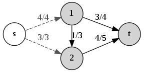 The figure on the right is a network having a value of flow of 7. The numerical annotation on each arrow, in the form x/y, indicates the flow (x) and the capacity (y). The flows emanating from the source total seven (4+3=7), as do the flows into the sink (3+4=7).