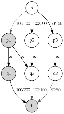 The above minimization problem can then be formulated as a minimum-cut problem by constructing a network, where the source is connected to the projects with capacity r(pi), and the sink is connected by the machines with capacity c(qj). An edge (pi, qj) with infinite capacity is added if project pi requires machine qj. The s-t cut-set represents the projects and machines in P and Q respectively. By the max-flow min-cut theorem, one can solve the problem as a maximum flow problem.
