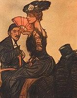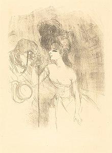 During the mid-1890s, Lautrec featured Dethomas in his art with some frequency.[63] On April 6, 1895, the former Moulin Rouge dancer Louise 'La Goulue' Weber commissioned two large canvases to adorn her travelling show's tent. Dethomas appears on the left-hand panel, looking down toward La Goulue.[64] At around the same period, Toulouse-Lautrec declared "I will capture your immobility in places of pleasure", and over the course of one and a half years, he made numerous preparatory sketches of Dethomas intended for a single painting, each taking anywhere from five to fifteen minutes to create.[65] Completed in 1896, the famous portrait of Maxime Dethomas at the Bal de l'Opera now hangs in the National Gallery of Art, Washington D.C.. Another portrait of his friend took the form of a risque lithograph entitled Debauche Avec Dethomas, and was later used on the cover of an exhibition catalogue of June, 1896.[66] Finally, an 1896 lithograph entitled Anna Held et Baldy also features Dethomas, leering provocatively at the famous stage performer. Toulouse-Lautrec gifted an annotated proof copy of this lithograph to Dethomas.[67]
