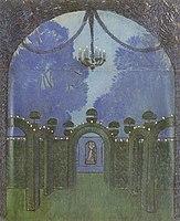 During his seventeen years in the theatre, Dethomas was artistic designer for over fifty plays, ballets and operas, featuring many of the era's most notable actors, dancers, singers, playwrights and composers, including Roussel, Stravinsky and Ravel.[38] In his colour schemes Dethomas used visual analogy paired with the play-writer's thematic intent, "the progression of each scene following perfectly the progression of the drama".[39] Dethomas once wrote that above all else decor should be a good servant of the play and that a designer must get beyond a "painterly feel" to something more solid.[40] Guillaume Apollinaire declared that Dethomas' influence on French Theatre had "transformed the art of scenery, costume design and staging."[41]