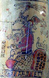 True lunar mythology is first and foremost represented by the Qʼeqchiʼ myth of Sun and Moon first studied by Eric Thompson.[1] It makes the Moon Goddess (Po) the daughter of the Earth God, or 'Mountain-Valley'. She is wooed and finally captured by Sun. They sleep together. When this is discovered and the couple flees, the angry father reacts by having his daughter destroyed. In all likelihood, this patriarchal punishment of a basic infraction of the rules of alliance represents the origin of menstruation, the 'evil blood' of a disobedient daughter colouring the water of sea and lake red, or sinking into the earth.[2] The menstrual blood is stored in thirteen jars. In the jars, it is first transformed into creatures such as snakes and insects, a transformation leading up to the origin of poison and the diseases caused by it. However, some jars also hold medicinal plants. The thirteenth jar is the lunar jar: On being opened, the Moon is reborn from it. The creation of her vagina on instigation of, or directly by, her husband represents the origin of human procreation. Subsequent episodes make the Moon Goddess cohabit with Sun's elder brother, Cloud, and with the devil in the shape of a king vulture, thus connecting her to rainfall and black sorcery.