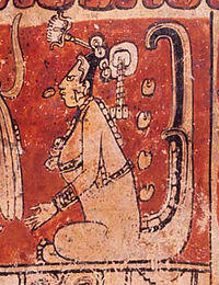 In the three Post-Classic codices, the Moon Goddess is underrepresented. Instead, one finds almanacs devoted to what appears to be her terrestrial counterpart, the Goddess I ('White Woman'). In Classic Maya art, however, the Moon Goddess occurs frequently.[5] She is shown as a young woman holding her rabbit, and framed by the crescent of the waxing moon, which is her most important, identifying attribute. The Moon Goddess may also be sitting on a throne, alone (as in the Dresden codex), or behind god D (Itzamna). Although, in oral tradition, the goddess is often treated as the consort of the Sun Deity, Classic iconography does not insist on this (see Kinich Ahau). The lunar rabbit (perhaps a Trickster character) has an important role to play in a poorly understood episode involving the Moon Goddess, the Twins, the Maya maize god, and the aged god L. In some cases, the Moon Goddess is fused with the main Maya maize god, making it uncertain whether what we see is a Moon Goddess with a maize aspect (that is, a maize-bringing moon), or a Maize God with a lunar aspect or function.