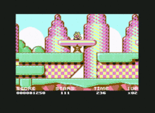 Happier music plays once all the enemies are defeated. It is then a race against the clock to collect the quota of stars and to get to the exit to complete the stage. The faster a star is rotating, the more points it is worth. If all stars are collected on a stage, then the player can receive a Super-Star bonus, but only on the first and last stage of the game on the cassette and disk versions of the game.