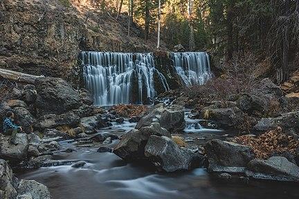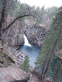The McCloud River watershed drains 674 square miles (1,750 km2).[5] It rises from several spring-fed streams in Colby Meadows in the Cascades approximately 10 miles (16 km) southeast of Mount Shasta in Siskiyou County. It flows initially west, passing south of Mount Shasta and receiving streams that drain the southern slope of the peak. East of McCloud it forms a series of waterfalls which tumble over basaltic lava flows, known collectively as the McCloud River Falls or Falls of the McCloud River.