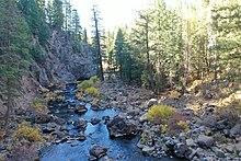 The Upper McCloud and its tributaries above Middle Falls are home to the McCloud River redband (Oncorhynchus mykiss stonei), a native subspecies of rainbow trout.[14] These redband trout were proposed for endangered species status, as their genetics have been introgressed by hybridization with hatchery stocked rainbow trout. The Falls of the McCloud River form a natural barrier to rainbow trout migration historically.[15] An amplified fragment length polymorphism study show Sheepheaven Creek (the type specimen) genetics to be sufficiently different to warrant subspecific status.[16] Conservation efforts have included transplanting the relative pure Sheepheaven Creek strain into Swamp and Trout Creeks.[15]