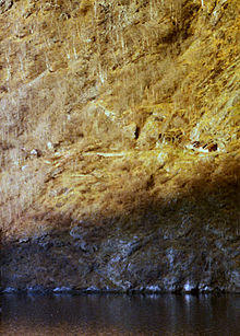 There is no natural harbour on the shore, just a small man-made landing place and some remaining stone walls that are remnants of an earlier boat shed. The boats were dragged onto dry land for safekeeping from the seas from the fjord.[1]