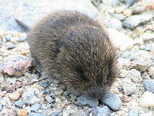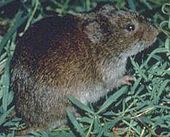 Meadow voles are most commonly found in grasslands, preferring moister areas, but are also found in wooded areas.[3] In eastern Washington and northern Idaho, meadow voles are found in relative abundance in sedge (Carex spp.) fens, but not in adjacent cedar (Thuja spp.)-hemlock (Tsuga spp.), Douglas-fir (Pseudotsuga menziesii), or ponderosa pine (Pinus ponderosa) forests. Meadow voles are also absent from fescue (Festuca spp.)-snowberry (Symphoricarpos spp.) associations. Moisture may be a major factor in habitat use; possibly the presence of free water is a deciding factor. In southeastern Montana, meadow voles were the second-most abundant small mammal (after deer mice, Peromyscus maniculatus) in riparian areas within big sagebrush (Artemisia tridentata)-buffalo grass (Buchloe dactyloides) habitats.[4] Meadow voles are listed as riparian-dependent vertebrates in the Snake River drainage of Wyoming. In a compilation of 11 studies[5] on small mammals, meadow voles were reported in only three of 29 sites in subalpine forests of the central Rocky Mountains. Their range extensions were likely to be related to irrigation practices.[6] They are now common in hayfields, pastures, and along ditches in the Rocky Mountain states.[7]