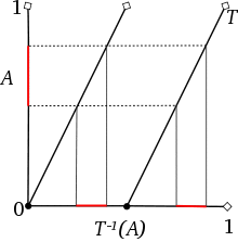 Consider now the special case of maps which preserve intersections, unions and complements (so that it is a map of Borel sets) and also sends to (because we want it to be conservative). Every such conservative, Borel-preserving map can be specified by some surjective map by writing . Of course, one could also define , but this is not enough to specify all such possible maps . That is, conservative, Borel-preserving maps cannot, in general, be written in the form Obviously! one might say; consider, for example, the map of the unit interval given by this is the Bernoulli map.