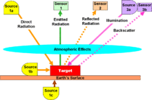 Remote sensing depends on the interaction of a source of energy with a target, and energy measured from the target.[20] In the "Remote Sensing" diagram, Source 1a is an independent natural source such as the Sun. Source 1b is a source, perhaps manmade, that illuminates the target, such as a searchlight or ground radar transmitter. Source 1c is a natural source, such as the heat of the Earth, with which the Target interferes.