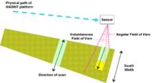 The instantaneous field of view (IFOV) is the area from which radiation currently impinges on the detector. The swath width is the distance, centered on the sensor path, from which signal will be captured in a single scan. Swath width is a function of the angular field of view (AFOV) of the scanning system. Most scanning sensors have an array of detectors such that the IFOV is the angle subtended by each detector and the AFOV is the total angle subtended by the array.